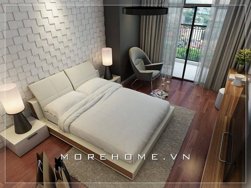 Giường ngủ chung cư phong cách hiện đại, khoảng vách đầu giường thiết kế kích thước lớn, gia chủ có thể dễ dàng ngồi tựa lưng thư giãn, đọc sách báo...