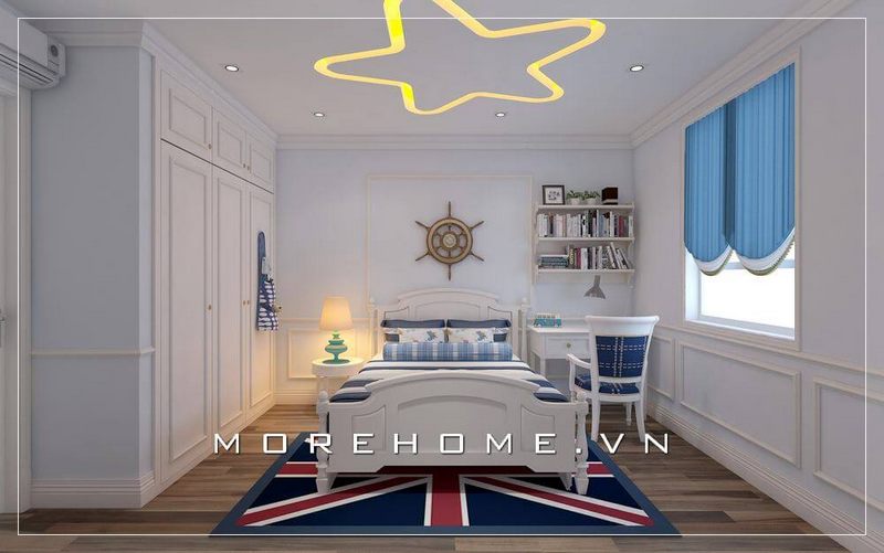 Mẫu giường ngủ gỗ tự nhiên phun sơn trắng sang trọng cho phòng ngủ bé trai tại biệt thự cao cấp