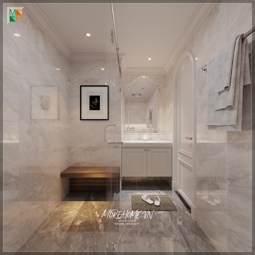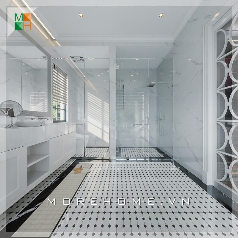 Mẫu thiết kế nội thất phòng tắm hiện đại sử dụng tone màu trắng chủ đạo thể hiện nét sang trọng tinh tế cho không gian nhà phố, biệt thự, chung cư.