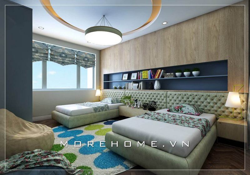 Thiết kế nội thất phòng đôi phong cách hiện đại dành cho nhà có 2 bé, chiếc giường ngủ bọc với nút chần độc đáo tạo điểm nhấn ấn tượng cho cả không gian phòng ngủ