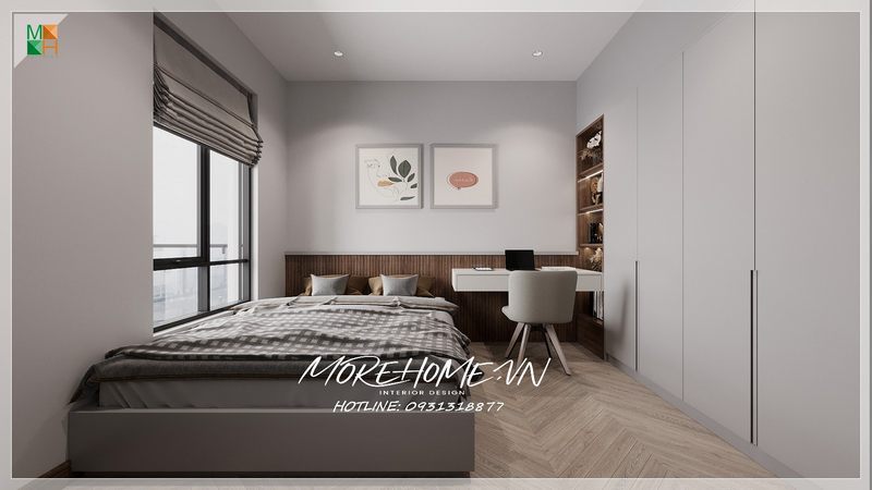Nội thất phòng ngủ chung cư gỗ công nghiệp hiện đại nhẹ nhàng, chiếc giường đa năng tích hợp ngăn kéo phía dưới tạo cho gia chủ sự tiện nghi nhất trong quá trình lưu trữ đồ đạc