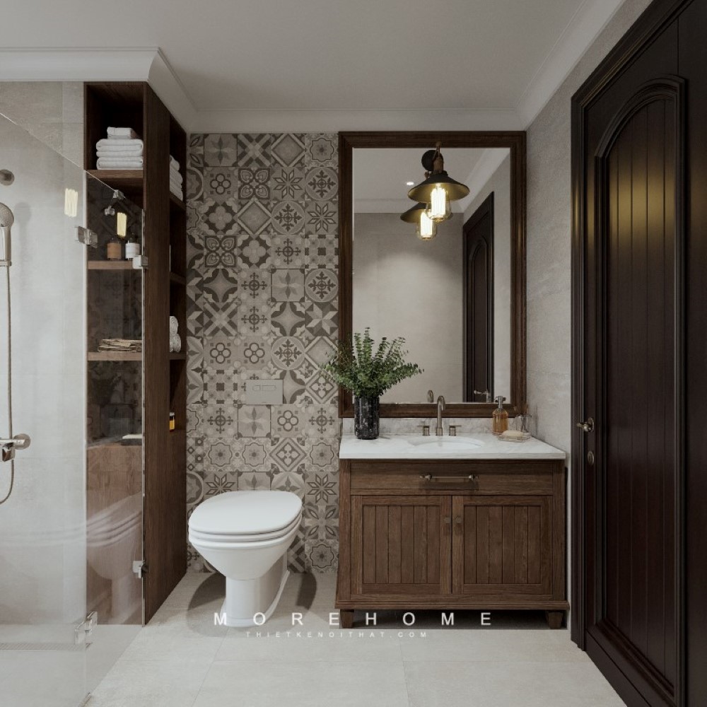 Phòng tắm là một không gian sinh hoạt hằng ngày, nội thất được thiết kế theo phong cách địa trung hải không, không quá sang trọng và cầu kì, hướng tới sự đơn giản, mộc mạc và gọn gàng.